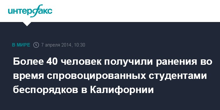 Москва. 7 апреля. INTERFAX.RU - По меньшей мере, 44 человека были отправлены в больницы и более 100 арестованы в США после того, как студенческая вечеринка в городке Айла Виста на побережье Калифорнии переросла в массовые беспорядки, сообщает американский телеканал Fox News.
