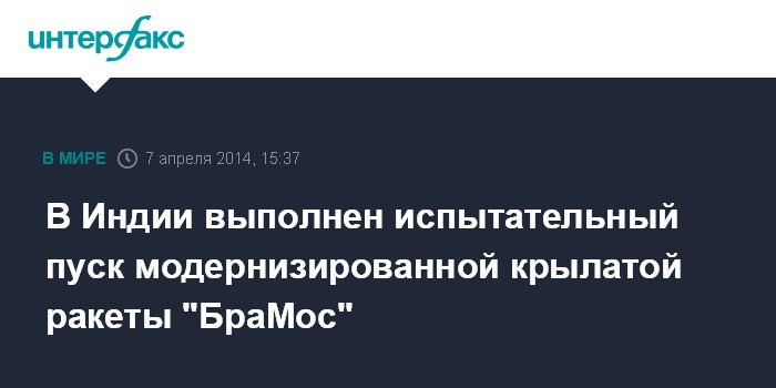 Москва. 7 апреля. INTERFAX.RU - Успешный испытательный пуск модернизированной крылатой ракеты "БраМос" индийско-российского производства выполнен в понедельник Сухопутными войсками Индии, сообщает агентство ПТИ со ссылкой на официального представителя Минобороны Индии.