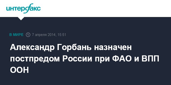 Москва. 7 апреля. INTERFAX.RU - Президент РФ Владимир Путин назначил Александра Горбаня постпредом России при Продовольственной и сельскохозяйственной организации Объединенных Наций (ФАО) и Всемирной продовольственной программе ООН (ВПП).