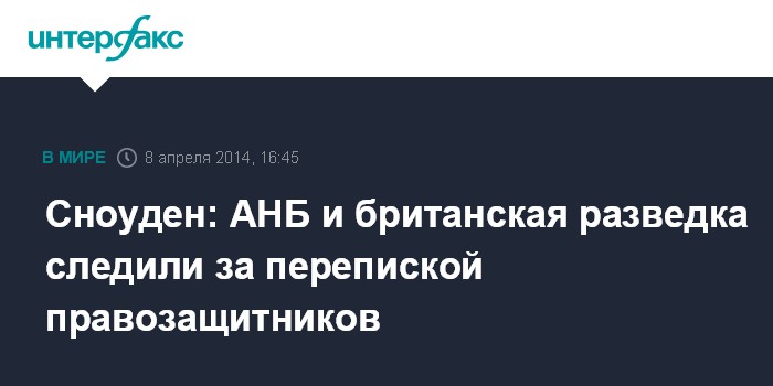 Москва. 8 апреля. INTERFAX.RU - Экс-сотрудник американских спецслужб Эдвард Сноуден заявил, что разведчики США и Великобритании следят за перепиской известных международных правозащитных организаций.