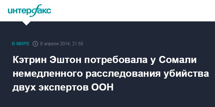 Москва. 8 апреля. INTERFAX.RU - Верховный представитель по иностранным делам и политике безопасности ЕС Кэтрин Эштон потребовала от сомалийских властей незамедлительно расследовать убийство двух экспертов ООН в Пунтленде (Сомали).