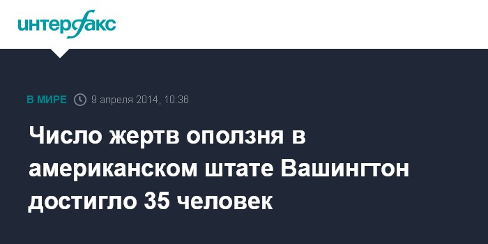 Москва. 9 апреля. INTERFAX.RU - До 35 выросло число жертв оползня, произошедшего в конце марта в американском штате Вашингтон, сообщили в среду власти графства Снохомиш.