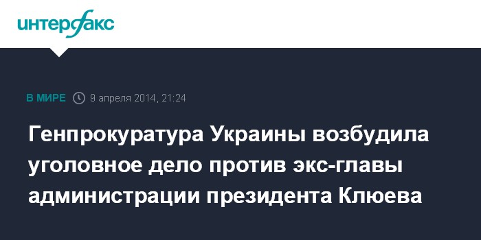 Москва. 9 апреля. INTERFAX.RU - Следственное подразделение Генеральной прокуратуры Украины внесло сведения в Единый реестр досудебных расследований об уголовном правонарушении, совершенном бывшим главой администрации президента Украины Андреем Клюевым.
