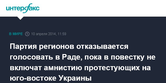 Москва. 10 апреля. INTERFAX.RU - Фракция Партии регионов не будет голосовать за законопроекты, пока Верховная Рада не включит в повестку дня законопроект об амнистии участников протестов в юго-восточных регионах Украины.