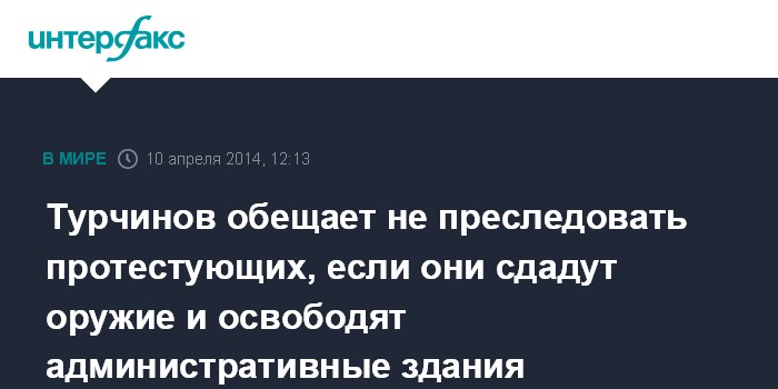Москва. 10 апреля. INTERFAX.RU - Председатель Верховной Рады Украины, и.о. президента Александр Турчинов заявил, что готов гарантировать отказ от уголовного преследования участников акций протеста на юго-востоке страны в случае добровольной сдачи ими оружия и освобождения захваченных административных зданий.