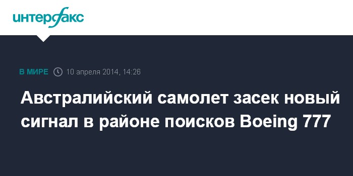 Москва. 10 апреля. INTERFAX.RU - Австралийский самолет P-3 Orion, задействованный в поисках исчезнушего 8 марта с радаров Boeing 777 компании Malaysia Airlines, засек новый подводный сигнал, который, возможно, исходит от "черных ящиков" пропавшего самолета.