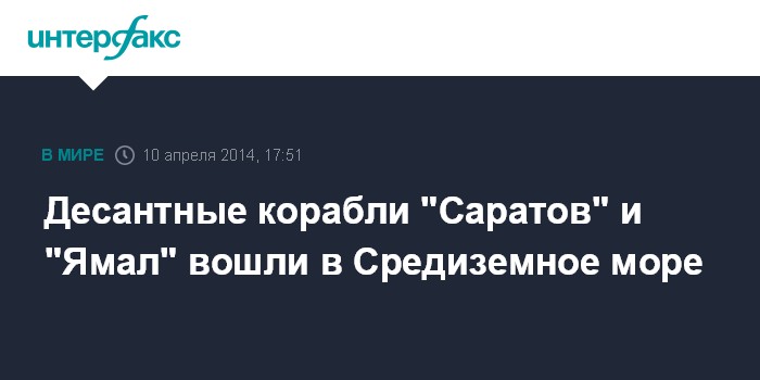 Санкт-Петербург. 10 апреля. INTERFAX.RU - Большие десантные корабли (БДК) Черноморского флота "Саратов" и "Ямал" отправились из Севастополя в Средиземное море для действий в составе постоянного оперативного соединения ВМФ, сообщили "Интерфаксу" в четверг в Главном штабе ВМФ.