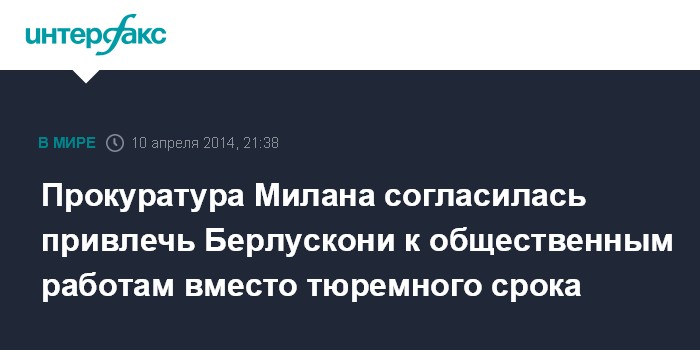 Москва. 10 апреля. INTERFAX.RU - Прокуратура Милана удовлетворила ходатайство адвокатов экс-премьера Италии Сильвио Берлускони предоставить ему право отбывать уголовное наказание за налоговое мошенничество в форме обязательных общественных работ, пишет в четверг итальянская газета Corriere della Sera.