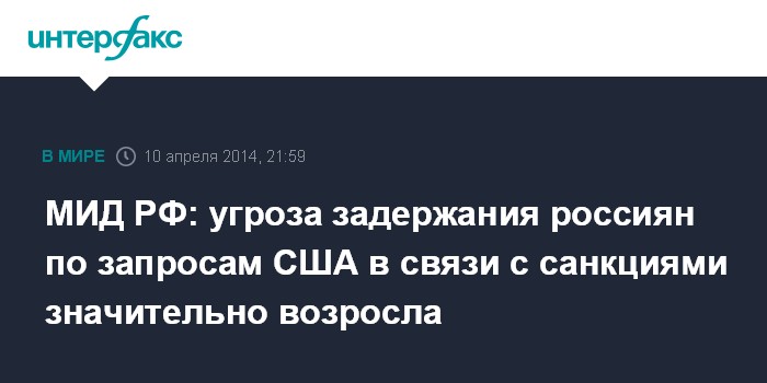 "В развитие выпущенного 2 сентября 2013 г. предупреждения гражданам Российской Федерации о возможности подвергнуться задержанию или аресту по запросам американских, правоохранительных органов и специальных служб МИД России обращает внимание, что в последнее время данная угроза существенно возросла в связи с введенными США антироссийскими санкциями", - говорится в предупреждении для российских граждан, размещенном на сайте МИД РФ.