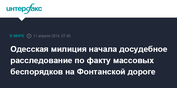 Киев. 11 апреля. ИНТЕРФАКС-УКРАИНА – Киевский районный отдел милиции Одессы начал досудебное расследование по факту массовых беспорядков возле отеля на Фонтанской дороге 10 апреля, сообщает отдел по связям с общественностью ГУ МВД в Одесской области.