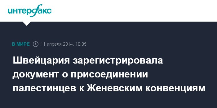 В заявлении департамента иностранных дел Швейцарии отмечается, что регистрация документа о присоединении палестинцев к Конвенциям состоялось в четверг на этой неделе.