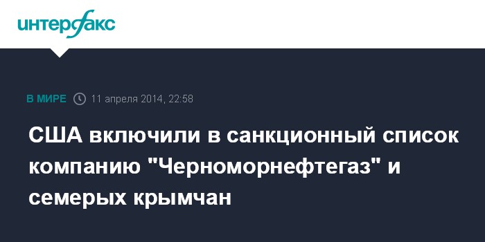 Вашингтон. 11 апреля. INTERFAX.RU - США распространили санкции на семерых представителей властных структур Крыма и Севастополя, а также на компанию "Черноморнефтегаз".