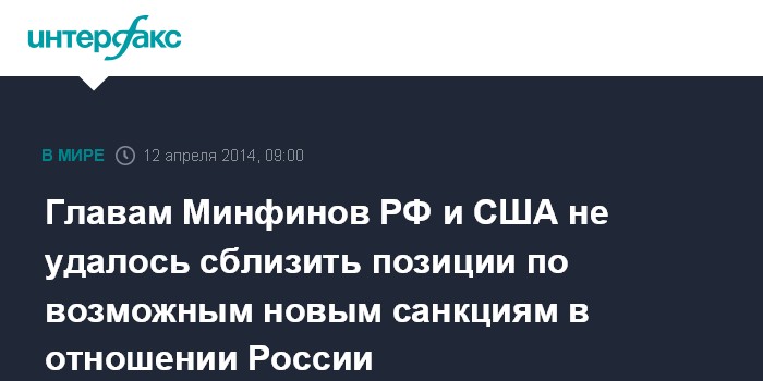 Москва. 12 апреля. INTERFAX.RU - Министры финансов России и США Антон Силуанов и Джейкоб Лью на встрече в Вашингтоне обменялись мнениями по возможному объявлению дополнительных санкций в отношении РФ, но не сблизили позиции своих стран.