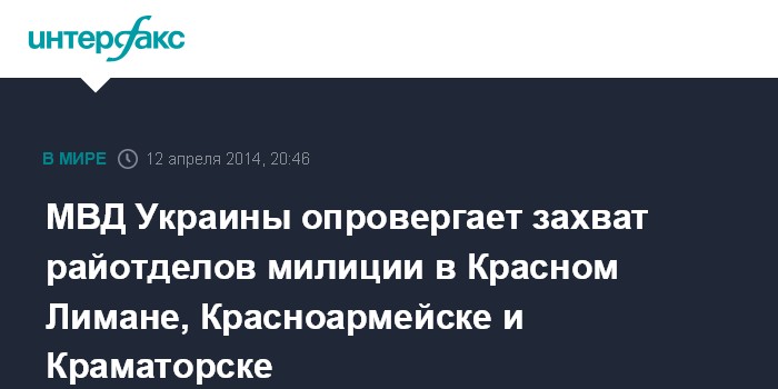 Москва. 12 апреля. INTERFAX.RU - МВД Украины вечером в субботу опровергло информацию о захвате райотделов милиции в Красном Лимане, Красноармейске и Краматорске Донецкой области.
