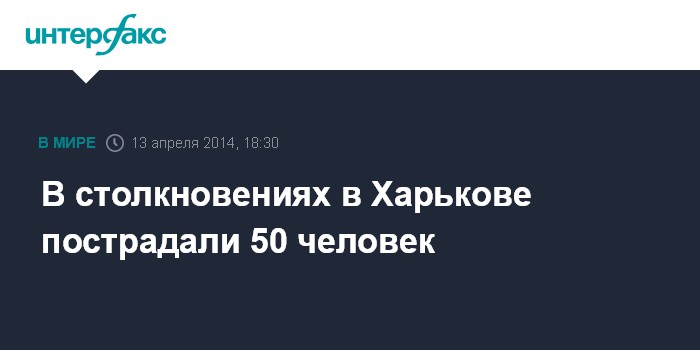 Москва. 13 апреля. INTERFAX.RU - В Харькове в результате столкновений между участниками двух митингов - за унитарную Украину и за федерализацию страны - пострадали 50 человек, в том числе один сотрудник милиции, сообщает пресс-служба облуправления МВД. "Медицинская помощь потребовалась 50 пострадавшим, около 10 человек были доставлены в больницы города. По информации медиков, травмы легкой и средней тяжести. Среди пострадавших - один сотрудник милиции", - отмечено в сообщении.