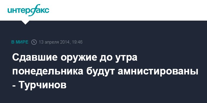 Москва. 13 апреля. INTERFAX.RU - Исполняющий обязанности президента Украины, председатель Верховной Рады Александр Турчинов заявил, что гарантирует освобождение от наказания тем, кто не стрелял в украинских правоохранителей и до утра понедельника, 14 апреля, сложит оружие и освободит захваченные на востоке страны административные здания.