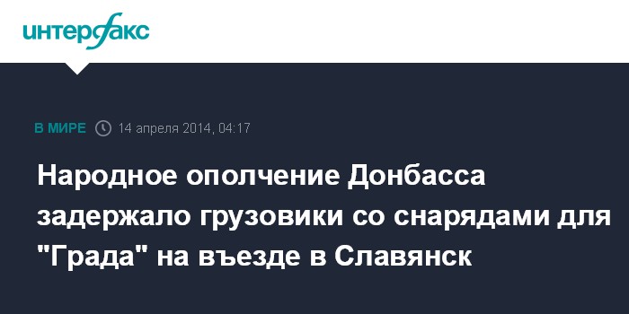 Москва. 14 апреля. INTERFAX.RU - Народное ополчение Донбасса задержало на въезде в город Славянск Донецкой области грузовики со снарядами для реактивной системы залпового огня "Град", сообщил телеканал "Россия 24".