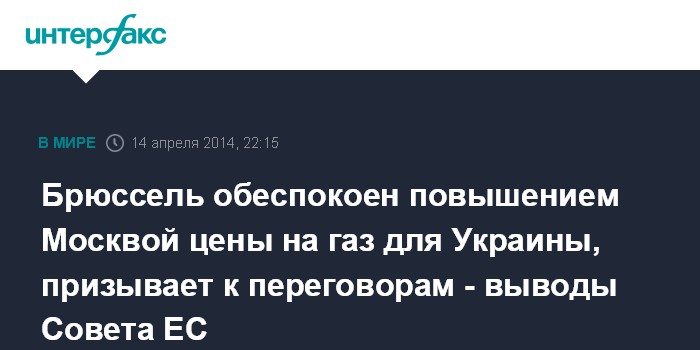 Брюссель. 14 апреля. INTERFAX.RU - Европейский Союз обеспокоен односторонним поднятием Россией цены на газ для Украины и призывает к переговорам по этому вопросу.