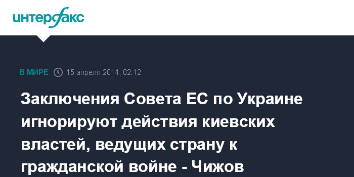 "В нем (в документе Совета ЕС - ИФ) много есть чего, но я хотел бы обратить внимание на то, чего в нем нет. К большому сожалению, в нем нет ни слова, никакой оценки действий киевских властей, готовых ввергнуть не только восток Украины, но и всю страну в пучину гражданской войны", - сказал высокопоставленный дипломат.