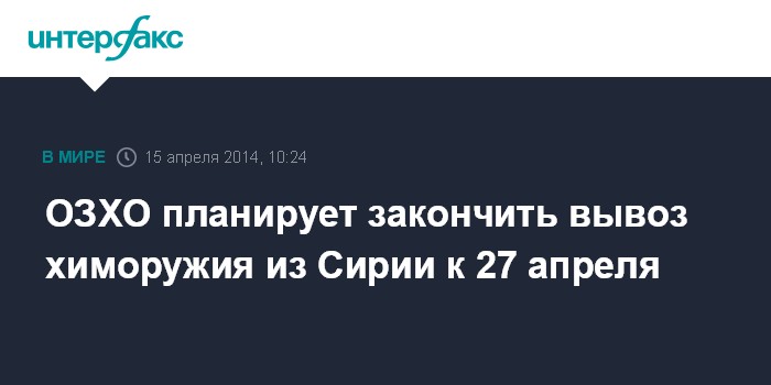 Москва. 15 апреля. INTERFAX.RU - Химическое оружие из Сирии будет вывезено к 27 апреля, заявляют в Организации по запрещению химического оружия (ОЗХО).