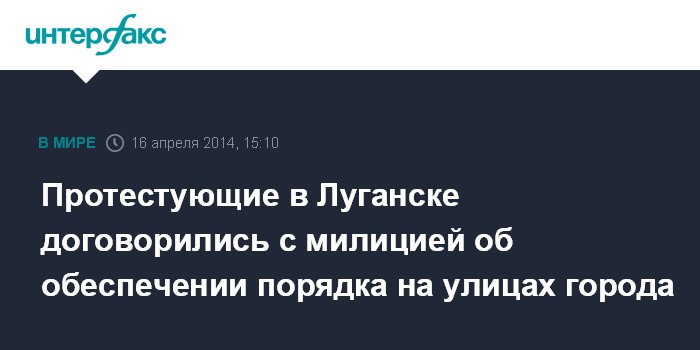Луганск. 16 апреля. INTERFAX.RU - В Луганске в среду состоялись почти двухчасовые переговоры представителей народного ополчения и руководства областного управления милиции, результатом которых стала договоренность об обеспечении безопасности в городе, передал корреспондент "Интерфакса".