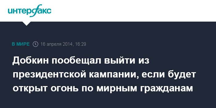 "Если на юго-востоке Украины нынешняя временная власть применит силу армии и откроет огонь по мирным жителям, я выйду из этой президентской кампании и никогда не признаю выборы президента состоявшимися. И никогда не признаю того, кого они назначат на эту должность", - сказал Добкин на пресс-конференции в Харькове в среду.