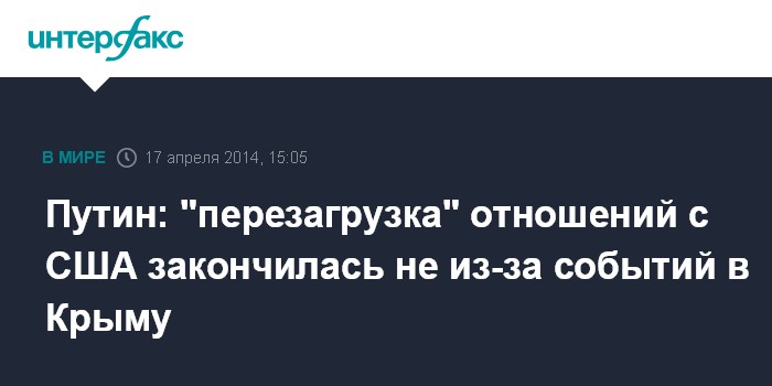 "Вы знаете, дело не в том, что это ("перезагрузка" - ИФ) закончилось сейчас в связи с Крымом. Я думаю, что это закончилось еще раньше, это закончилось сразу же после событий в Ливии", - сказал Путин в ходе "прямой линии".