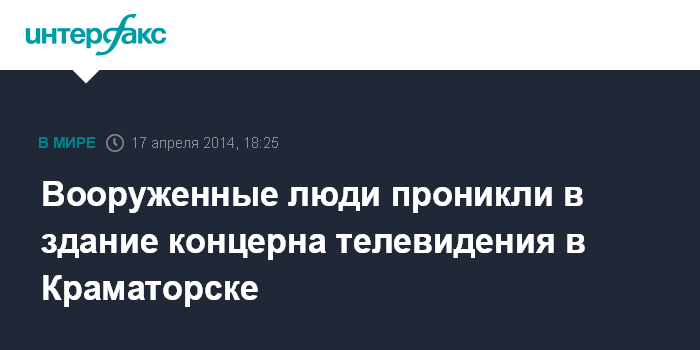 Киев. 17 апреля. INTERFAX.RU - Вооруженные лица в четверг проникли на территорию объекта, принадлежащего Концерну радиовещания, радиосвязи и телевидения (КРРТ) в Краматорске Донецкой области и получили доступ к оборудованию, говорится в письме руководителя концерна Константина Захаренко, направленного в Государственную службу специальной связи и защиты информации, обнародованном в четверг.