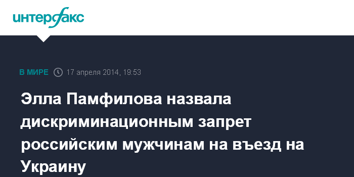 Москва. 17 апреля. INTERFAX.RU - Уполномоченный по правам человека в РФ Элла Памфилова считает, что ограничение на работу на Украине российских журналистов, а также запрет на въезд на территорию Украины россиян - мужчин от 16 до 60 лет носит дискриминационный характер.