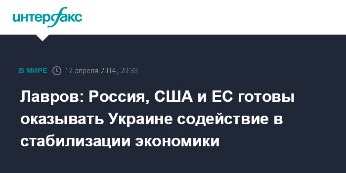 "Мы отметили важность экономической и финансовой стабильности на Украине, которая сейчас серьезнейшим образом подорвана. Сказали, что мы будем готовы обсуждать в последующем поддержку усилий по стабилизации экономики Украины по мере реализации тех шагов, о которых я сейчас сказал",- сказал Лавров на пресс-конференции в Женеве.