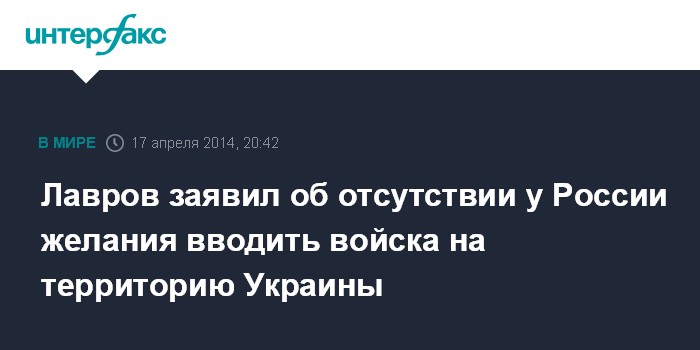 "У нас нет никакого желания вводить наши войска на Украину, на территорию дружественного нам государства, на территорию, где живет братский народ. Это противоречит коренным интересам Российской Федерации", - заявил Лавров по итогам встречи "четверки" по Украине в Женеве.