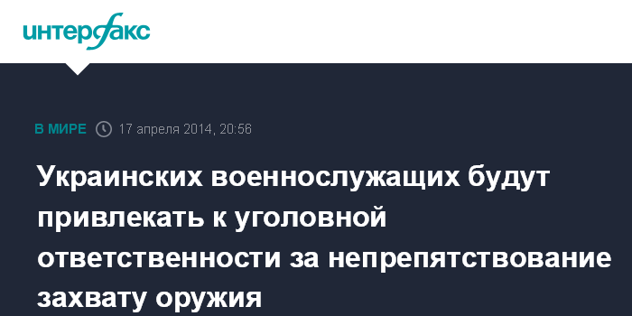 Киев. 17 апреля. INTERFAX.RU - Генпрокуратура Украины напомнила военнослужащим об уголовной ответственности в случае, если они не препятствуют захвату оружия и техники.