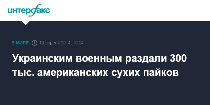 Москва. 18 апреля. INTERFAX.RU - На базе одного из центров обеспечения тыла вооруженных сил Украины в четверг завершена отгрузка в войска последней партии американских сухих пайков MRE (meal ready to eat - "пища, готовая к употреблению").