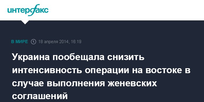 Киев. 18 апреля. INTERFAX.RU - В Киеве заявляют, что интенсивность проведения силовой операции на юго-востоке Украины будет зависеть от выполнения протестующими достигнутых в Женеве договоренностей.