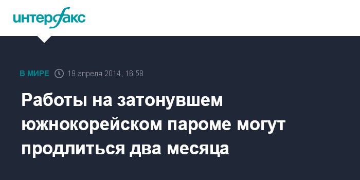 Москва. 19 апреля. INTERFAX.RU - Операция по поиску жертв и подъему затонувшего в среду южнокорейского парома "Севоль" может продлиться два месяца, сообщили в субботу южнокорейские официальные лица.