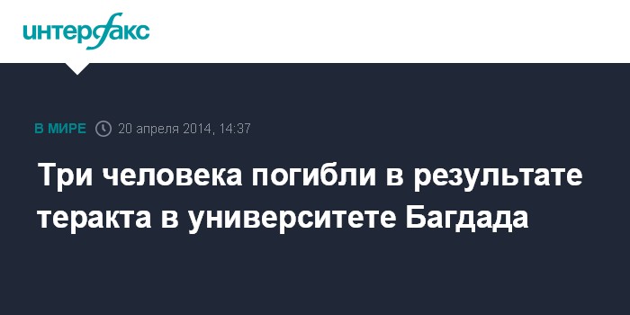 Москва. 20 апреля. INTERFAX.RU - Три человека стали жертвами действий террориста-смертника на территории университета в иракской столице Багдаде, сообщили в воскресенье западным журналистам в МВД Ирака.