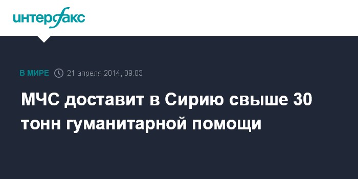 "22 апреля самолет МЧС РФ доставит в Сирию свыше 30 тонн гуманитарной помощи, в том числе теплые палатки, одеяла и продукты питания", - сказал он "Интерфаксу".