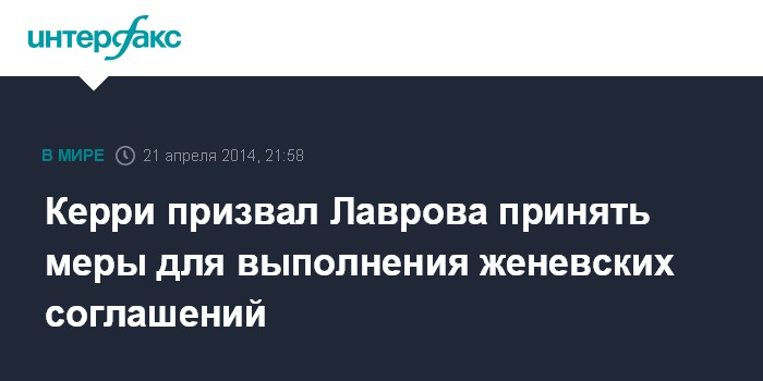 Вашингтон. 21 апреля. INTERFAX.RU - Госсекретарь США Джон Керри в понедельник провел телефонную беседу с главой российского МИДа Сергеем Лавровым и призвал РФ способствовать выполнению женевских договоренностей по Украине, сообщила представитель госдепартамента Дженнифер Псаки.