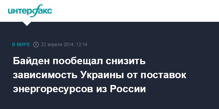 Москва. 22 апреля. INTERFAX.RU - Вице-президент США Джозеф Байден во вторник в Киеве выразил готовность помочь Украине снизить зависимость от поставок энергоресурсов из России, передает агентство AP.