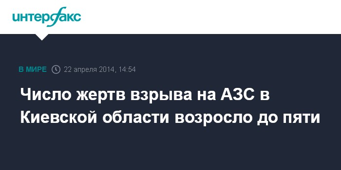 Москва. 22 апреля. INTERFAX.RU - Число погибших в результате взрыва на заправочном комплексе в Переяслав-Хмельницком (Киевская область) увеличилось до пяти человек, сообщает пресс-служба Госслужбы по чрезвычайным ситуациям.