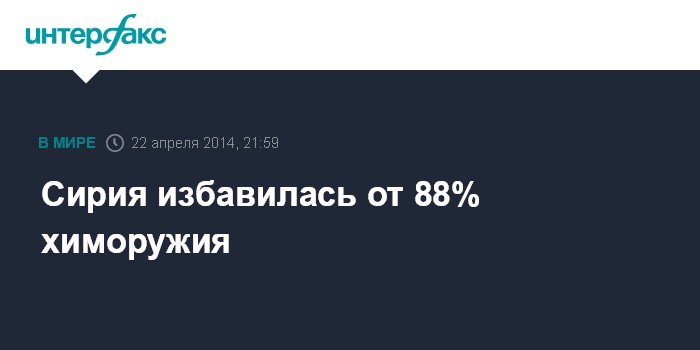 Москва. 22 апреля. INTERFAX.RU - Около 88% задекларированных сирийскими властями материалов для изготовления химоружия или вывезены из страны, или уничтожены, заявила в среду спецкоординатор совместной миссии Организации по запрещению химического оружия (ОЗХО) и ООН Сигрид Кааг.