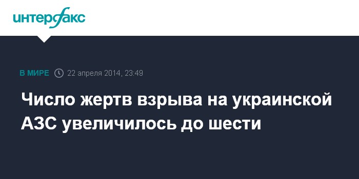 Москва. 22 апреля. INTERFAX.RU - Количество жертв в результате взрыва на автозаправочном комплексе в Переяславе-Хмельницком (Киевская область Украины) увеличилось до шести человек.