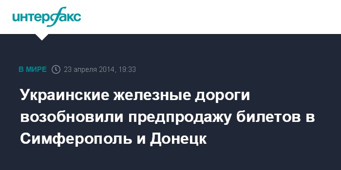 Москва. 23 апреля. INTERFAX.RU - Государственная администрация железнодорожного транспорта Украины ("Укрзализныця") возобновила предварительную продажу билетов на поезда, которые отправляются с 10 по 27 мая в направлении из Киева в Симферополь, Донецк и ряд других городов, сообщила пресс-служба ведомства.