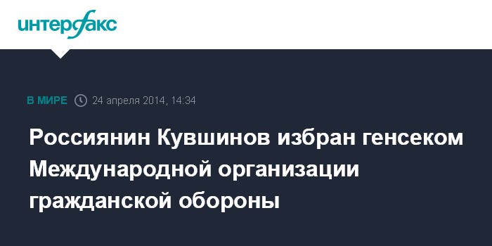 Москва. 24 апреля. INTERFAX.RU - Россиянин Владимир Кувшинов избран генеральным секретарем Международной организации гражданской обороны (МОГО), сообщил официальный представитель МЧС России Александр Дробышевский.
