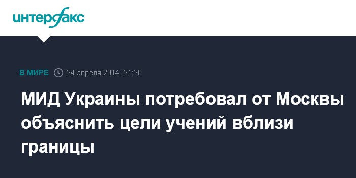 Москва. 24 апреля. INTERFAX.RU - МИД Украины потребовал, чтобы Россия объяснила цели учений вблизи украинской границы. Об этом говорится в сообщении украинского внешнеполитического ведомства.