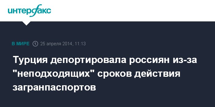 Москва. 25 апреля. INTERFAX.RU - Российская семейная пара вынуждена была покинуть Турцию сразу по прилету, так как загранпаспорт мужа не отвечал новым правилам по срокам действия, сообщила "Интерфаксу" пресс-секретарь Российского союза туриндустрии (РСТ) Ирина Тюрина в пятницу.