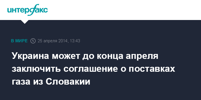 Москва. 25 апреля. INTERFAX.RU - Газотранспортные операторы Украины и Словакии - "Укртрансгаз" и Eustream - могут подписать меморандум о реверсных поставках природного газа 28 апреля.