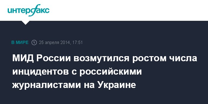 Москва. 25 апреля. INTERFAX.RU - В МИД России возмущены ростом количества инцидентов с российскими журналистами на Украине и вновь обращают внимание представителя ОБСЕ по вопросам свободы СМИ Дуньи Миятович на необходимость неизбирательного реагирования на репрессивные действия Киева в отношении журналистов.