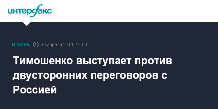 Москва. 26 апреля. INTERFAX.RU - Лидер партии "Батькивщина", кандидат в президенты Юлия Тимошенко считает неприемлемой инициативу народного депутата, кандидата в президенты Петра Порошенко о проведении двусторонних переговоров с Россией.