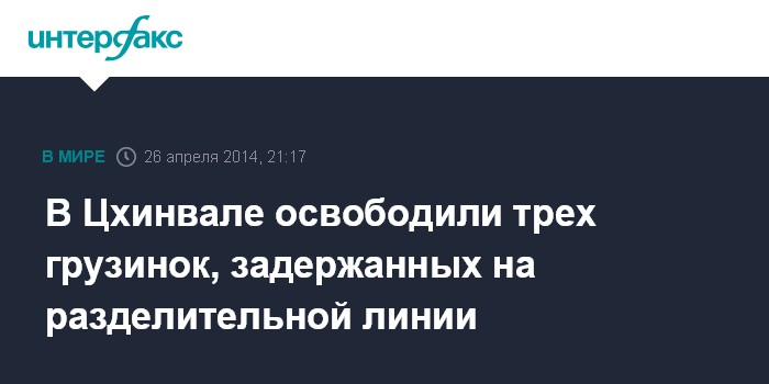 Тбилиси. 26 апреля. INTERFAX.RU - Югоосетинская сторона в субботу освободила из цхинвальского изолятора задержанных два дня назад за нарушение разделительной линии трех женщин из грузинского села Хурвалети, сообщила журналистам заместитель госминистра по вопросам примирения и гражданского равноправия Кетеван Цихелашвили.